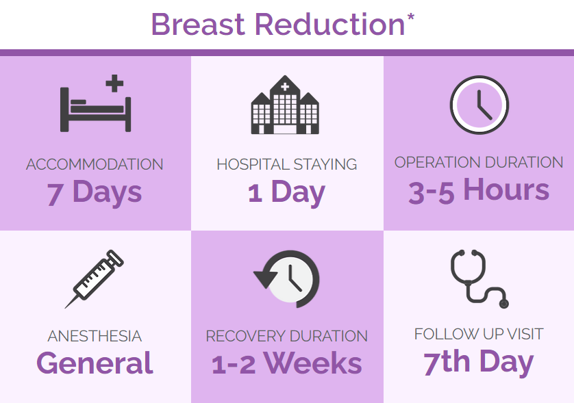 Following breast reduction, a wound dressing and bandage will be applied. An elastic bandage or support bra will be recommended to reduce swelling and support the breast as it heals. A breast reduction most often can be conducted as an outpatient procedure and does not require an overnight hospital stay, most patients are sent home the same day after surgery. However it is highly advisable to avoid lifting heavy objects or do strenuous workout for 3 to 4 weeks or more.