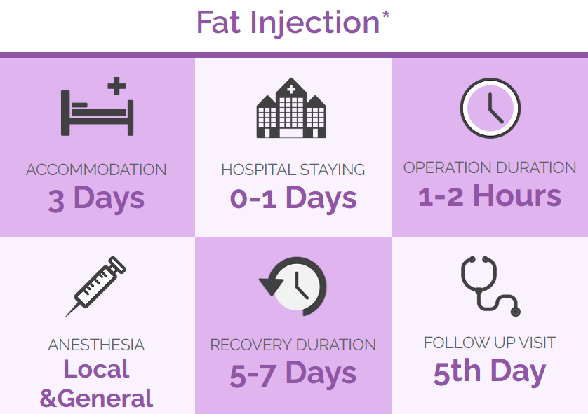 Fat transfer procedure is safe, natural, minimally invasive procedure that includes transfer of fat from one area of your body, usually your stomach, buttocks or thighs through Liposuction and then transferring it to a desired area. The most preferred operations in fat transfer are due to volume loss in the cheeks or face, laugh lines, thin lips, small breasts, volume loss in the buttocks, wrinkled hands, scars, pock marks, and marks from previous surgeries. Fat transfer is a surgery that includes the use of liposuction. And the procedure generally takes one to two hours and most patients are sent their hotels at the same day.