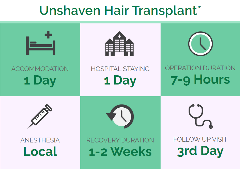 Unshaven FUE is preferred for men and women who have small transplant area and hair enough to allow transferring hair follicles between hair strands. Unshaven hair transplant surgery can be performed without the need for a haircut, this is the only difference between FUE method and Unshaven Hair Transplant. This technique is ideal for those who prefer to keep all of their hair during the procedure rather than having some of it shaved off. In Unshaven Hair Transplant, the graft number ranges between 500 and 2000, so those who only require a few grafts achieve the best results.